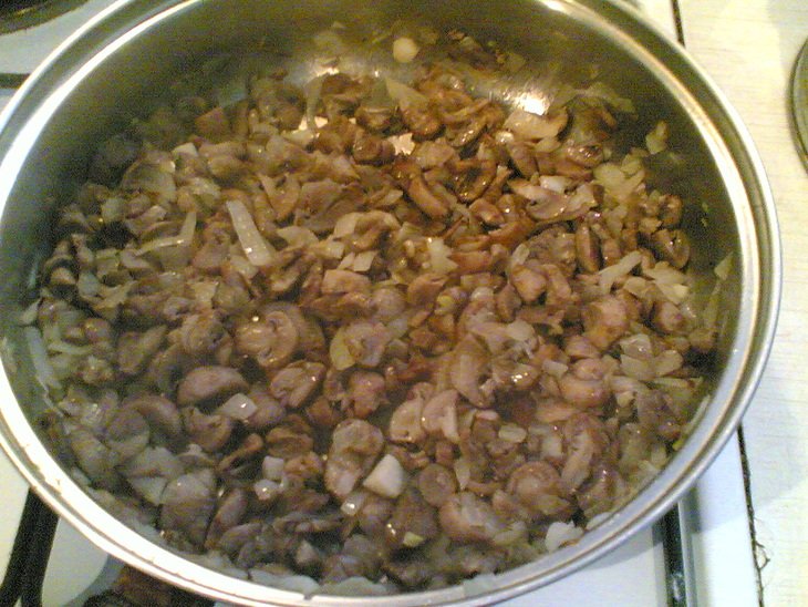 На масле пожарить измельченный лук, добавляем грибы,обжариваем. Затем добавляем муку, заливаем сметаной, доводим ло кипения, и оставляем остывать.