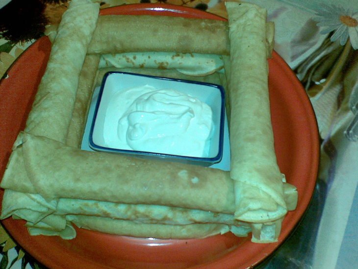 На готовый блин кладём немного начинки, сворачиваем в трубочку, и укладываем на блюдо в виде колодца.