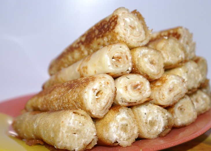 Выпекать блинчики на сильном огне, смазывая маслом сковороду. Наливаем тоненько.