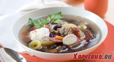 6. Колбасу нарежьте ломтиками и вместе с корейкой, мясом и лавровым листом добавьте в суп, варите 5 минут.