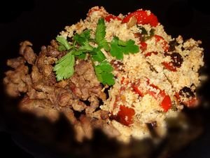 Кук-кус залить 2 стаканами кипятка,накрыть и дать набухнуть в течении 10 мин.Смешать с овощами,добавив приправы,зелень,чуть масла и соль.На блюдо выложить кус-кус с овощами и сверху мясо.