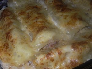 Залить каннелони сливками и посыпать оставшимся сыром, сверху можно присыпать молотой паприкой.
