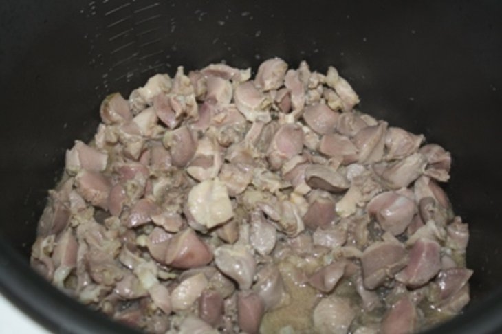 1.Куриные желудки промыть, нарезать небольшими кусочками.