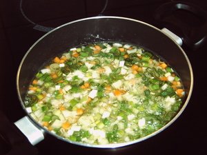 2.Подготовленные овощи сложить в кастрюлю с толстым дном,посыпать имбирем и молотым перцем, залить сверху бульоном и довести до кипения. Дать малость покипеть.