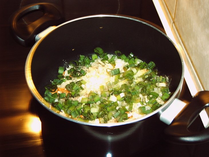 1.Почистить морковь и порезать маленькими кубиками. Очищенные лук и чеснок мелко порубить. Зелёный лук нарезать тонкими кольцами.