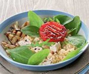Моццареллу нарезать кубиками. На тарелку выложить кускус, сверху – обжаренный помидор и лук, посыпать моццареллой. Листья рукколы и шпината промыть и просушить, добавить в блюдо.