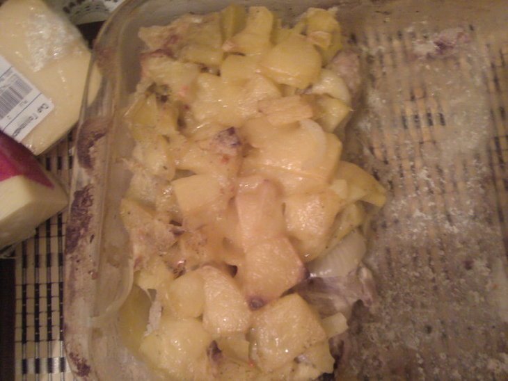 Берем куриные ножки, маринуем их в майонезе с солью,перцем всё это дело ставим на ночь в холодильник. ну можно часов на 7.Чистим картофель, режем его тонкими круглыми ломтиками, лук чистим, так же нарезаем не толстыми полукольцами. Затем достаем сковороду или что там у вас имеется для запекания в духовке, я брала жаропрочную стеклянную форму(всегда в ней готовлю), смазываем растительным маслом, выкладываем куриные ножки плотным слоем внизу формы, затем укладываем слой лука, и на него картошку. Посолить картошку не забудьте! ))) Затем берем сливки, разбавляем с 2-3 ст.л. майонеза, терем сыр на мелкой терке, всё это дело перемешиваем в блендере до однородной массы, по мере мешания смотрим,чтобы было не густо, если необходимо, добавляем сливок, далее всей этой смесью поливаем равномерно наше описаное верхнее, главное смотрите,чтобы сливок было не чересчур много, а то будут кипеть,выливаться и подгорать., залили значит, .бенрем крупную терку и трем сыр, посыпаем им сверху и ставим на 30-40 минут в духовку. ( я духовку не разогревала, так как готовила в стеклянной посуде, а её ставят в холодную духовку). Достаем, раскладываем порционно, получается сверху картошка,потом лук, потом курица. Такое готовила впервые, пробовала у свекрови на дне рождения, понравилось, правда у нее немного подгорело, она майонеза сверху много наложила. я подавала с салатом из огурцов и помидор с маслом. Приятного аппетита!
