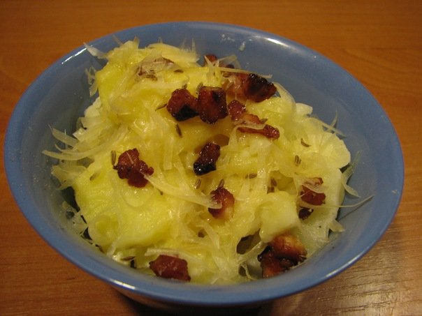На готовую картошку высыпать бекон, зиру и тертый пармезан