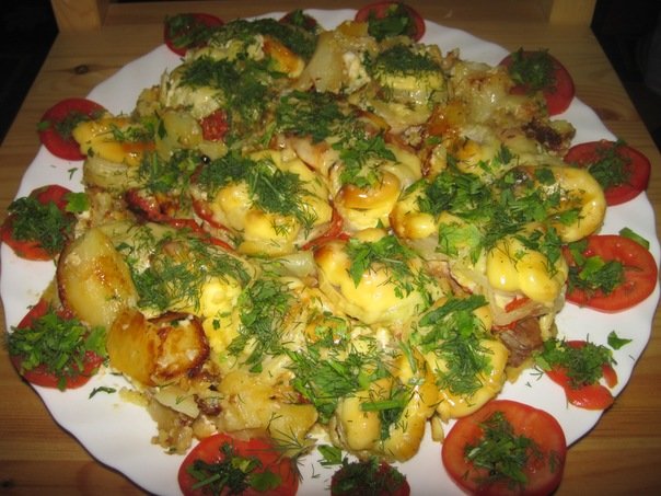 за 5 минут до готовности добавляем ещё 150г.тёртого сыра,выключаем духовку.