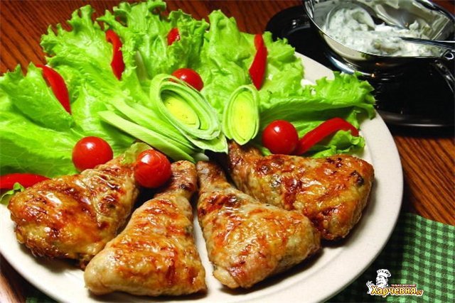 В сковородке отдельно обжариваем лук до золотистости, добавляем грибы и жарим их до полуготовности. Добавляем эту смесь в перекрученное мясо, подливаем туда сливки, немного взбитые яйца, орехи и коньяк. По вкусу добавляем соль и специи. Набиваем кожицу хорошенько, чтобы казалось, что это целая ножка, закрепить кожицу сверху можно зубочистками. Жарить в духовке на смазанном маслом противне при 180 С примерно 25-30 минут.