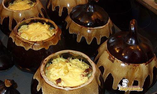 Параллельно очищаем грибы от кожуры и нарезаем их маленькими ломтиками. Ставим их тушиться на слабый огонь, добавляем к ним две ложки томатной пасты вместе с яйцом и сметанной. Сверху посыпать муку и перемешать ингредиенты, еще потушить несколько минут. Далее смешиваем обе приготовленные массы, выкладываем ее в горшочки и засыпаем сверху сыром. На несколько минут ставим блюдо в духовку, чтобы сыр образовал вкусную корочку.