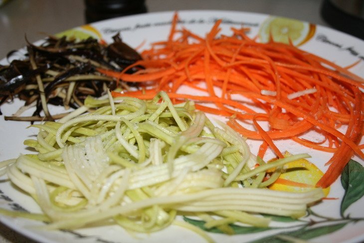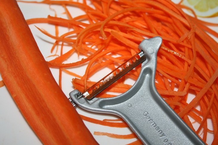 Вымыть овощи. Нарезать длинной соломкой спец. нарезкой.