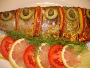 Рыбу хорошо вымыть, сделать несколько надрезов. Посолить, поперчить. Нарезать полукольцами помидор, лук, лимон. Положить в каждый надрез эти овощи. Во внутрь тушки кладем мелко нарезанный укроп или петрушку. Смазываем слегка майонезом. Заворачиваем в фольгу. Запекаем минут 15-20 ( в зависимости от размера рыбы.)