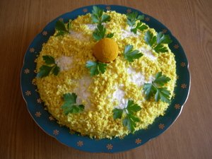 Для украшения целый желток обвалять в куркуме, разместить в середине салата, посыпать рубленными желтками, смешанными с остатками куркумы, также украсить веточками петрушки.