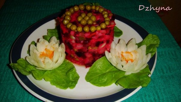 Свекла,картофель,квашеная капуста,марин. или соленые огурцы,морковь,репчатый лук,конс горошек,растительное масло.