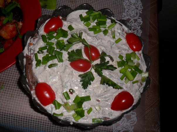соус: майонез домашний и сметана, грецкие орехи и чеснок (количество, столько сколько вам нравится) зелень, черный перец молотый, все смешать.