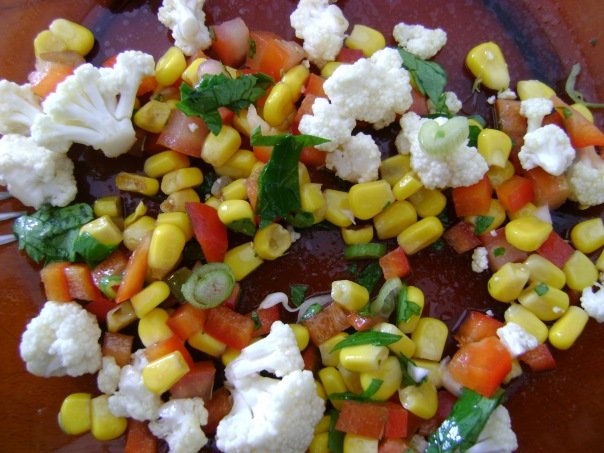 1/2 красного сладкого перца; 1 помидор (очищенный от внутренностей); 1 свежий лук (зеленая часть и чуть белой части); 150 грамм консервированной кукурузы; 1/4 кочана цветной капусты; петрушка. Все порезать, как на фото. Заправка: соль, розмарин, оливковое масло и бальзамический уксус.