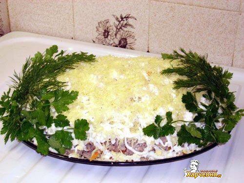 Сначала идет слой грибов с луком, за ним картофель и немного майонеза. Следующий идет слой курицы, его посыпать тертым сыром 1/3 от общей массы. Сверху выложить маринованные огурцы, морковь, потом яблоко и майонез.
