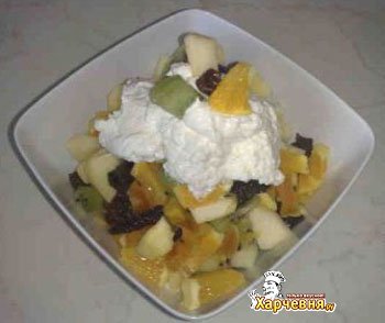 Чернослив изюм и курагу промыть, и залить кипятком на 5 минут. В это время киви, яблоко и апельсин почистить, и порезать кубиками. Когда чернослив и курага станут мягким, просушить и нарезать небольшими кусочками. Если изюм попался крупный, такой как «дамский пальчик», его тоже необходимо порезать. Салат смешать, выложить в салатницу горкой, и сверху положить творог. Для придания нежного вкуса творогу его можно слегка взбить блендером.