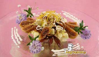 Инжир залить кипятком, откинуть на дуршлаг, остудить. Финики очистить от косточек. Эти фрукты порезать на кубики. Коньяк, или вино, смешать с соком половинки лимона и залить фрукты. Дать простоять не менее 1 часа. Сметану необходимо взбить с корицей и сахаром. На блюдо выложить, с одной стороны, инжир и финики, заправленные коньяком и лимонным соком. С другой стороны, нарезанные яблоки со сметаной. Перед подачей к столу салат немного посыпать свежее натертой цедрой.