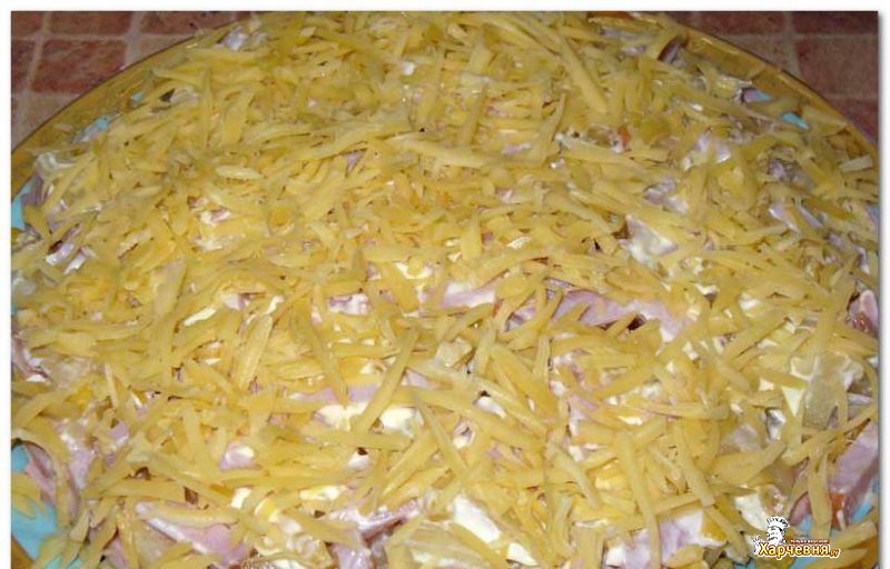 Выложите на большое блюдо лук и чуть-чуть посыпьте сахаром, чтобы убрать лишнюю горькость. Сверху положите картошку и колбасу и полейте майонезом, хорошенько размазав его. Теперь кладем слой ананасов, кукурузы и ветчины и еще раз смазываем майонезом. И в завершение посыпаем салат тертым сыром.