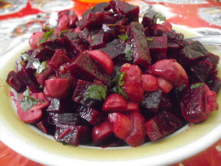 Оливковое масло взбить с уксусом,перцем и солью.Полученным соусом заправить салат.Украсить зеленью петрушки.