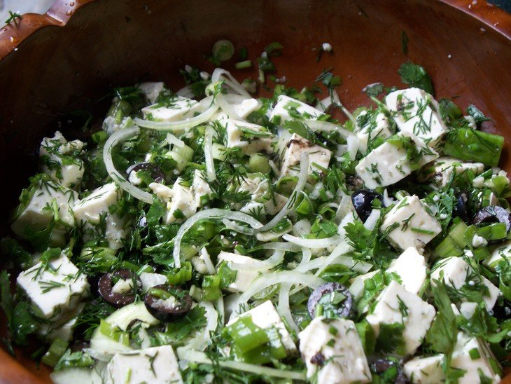 В глубокую посуду складываем порезаный сыр двух сортов,добавляем порезаные укроп+кинзу+оливки+чеснок+лук репчатый+лук зелёный+чёрный перец+оливковое масло+сок от оливок,перемешать и дать настоятся минут 20-30.