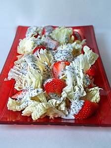 Вложить на тарелку листья салата,ягоды и полить соусом.