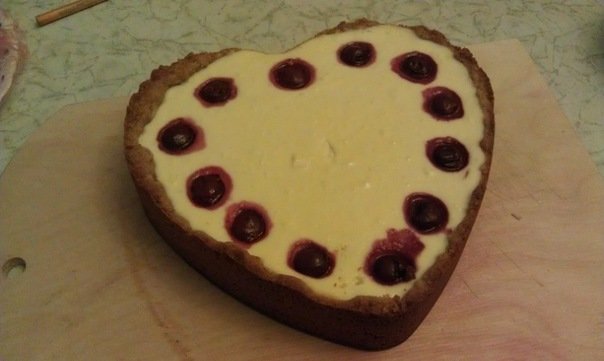 500 грам творога смешала с сахаром, взбила хорошенько, добавила 3 яйца, и грам 150 жирных сливок. Взбивала до пышности. Готовую начинку залила в форму на выпеченое тесто и выпекала еще 50 минут, потом выключила духовку и оставила еще минут на 10.