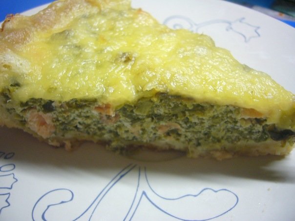 150гр. размягченного маргарина смешать с 1 яйцом и 200гр.муки,посолить,замесить тесто и убрать в холодильник на 30 минут. Начинка: 1 упаковка замороженного шпината,200мл. сметаны,2 яйца,200 гр.слабосоленой семги (форели или лосося),50-70гр.тертого сыра.Шпинат разморозить и отжать,рыбу нарезать соломкой,все смешать со сметаной и яйцами.Тесто раскатать и выложить в форму,сформировав бортики,вылить начинку,сверху посыпать тертым сыром. Выпекать 30-40 минут при 200гр.