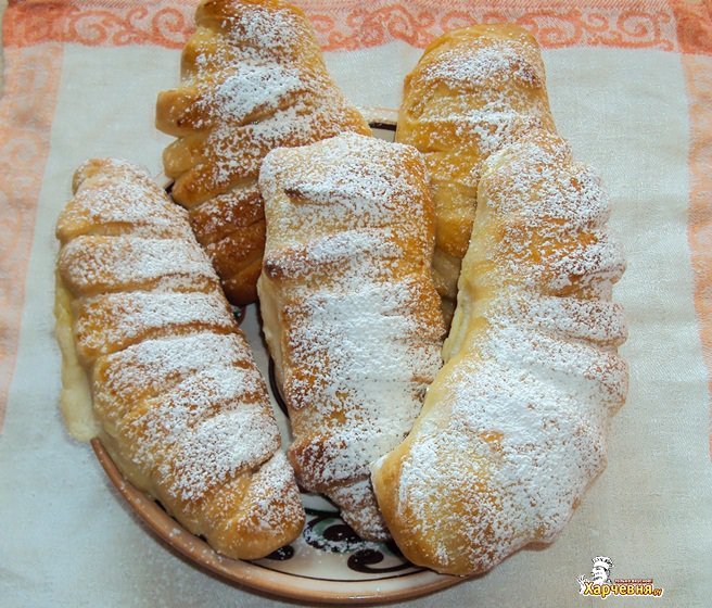 Когда тесто подойдет, делим его на 16 ровных частей. Растачиваем каждую из них овалом, длинной в 15 сантиметров. На край овала ставим крем, закрываем его тестом и соединяем края, оставляя половину овала нетронутой. Ее ножом надрезаем на несколько полосок, каждую из которых обматываем вокруг булочки. Такую же операцию проводим с остальным кремом и тестом.