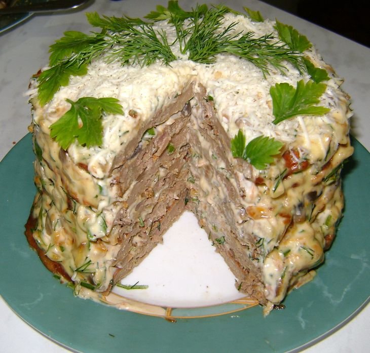 печёночный торт с грибами.