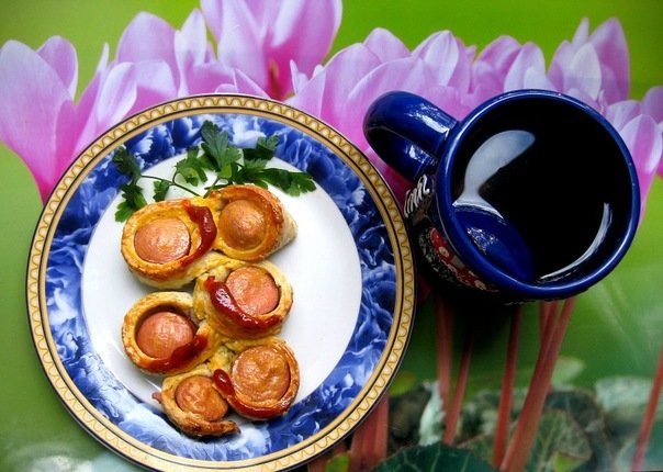 Нагреть молоко, растопить в нем слив. масло, всыпать соль, сахар, дрожжи, размешать до полного растворения, всыпать петрушку. Влить эту смесь в муку и замесить не тугое тесто. Разделить тесто на 5 жгутов и раскатать по длине сосисок и такой ширины, чтобы тесто можно было сложить вдвое и защепить края. Кладем на часть теста сосиску, накрываем свободной частью и защипываем края, разрезаем сосиску в тесте поперек, но не до конца, нарезанные части раскладываем так, чтобы получилась такая «конструкция», как на фото. Взбиваем желток, смазываем сосиску в тесте сверху желтком, выкладываем на застеленный пергаментом и смазанным раст.маслом противень. Запекаем при 180 градусах 20-30мин.
